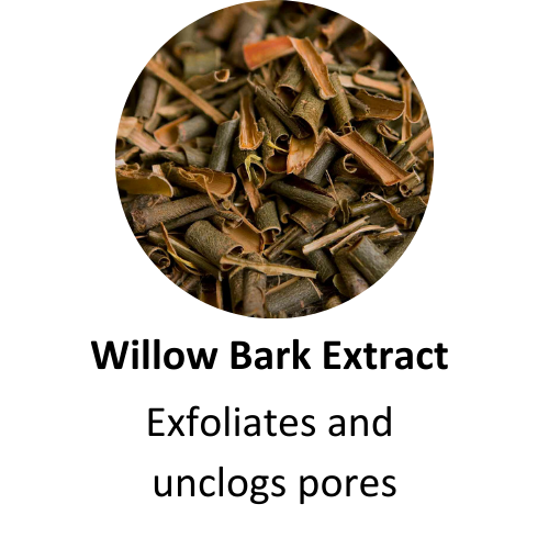 Willow bark extract (rich in salicylic acid) easily penetrates the pore lining and scoops out the dirt, debris, and sebum, hence prevents acne causing bacterial buildup.