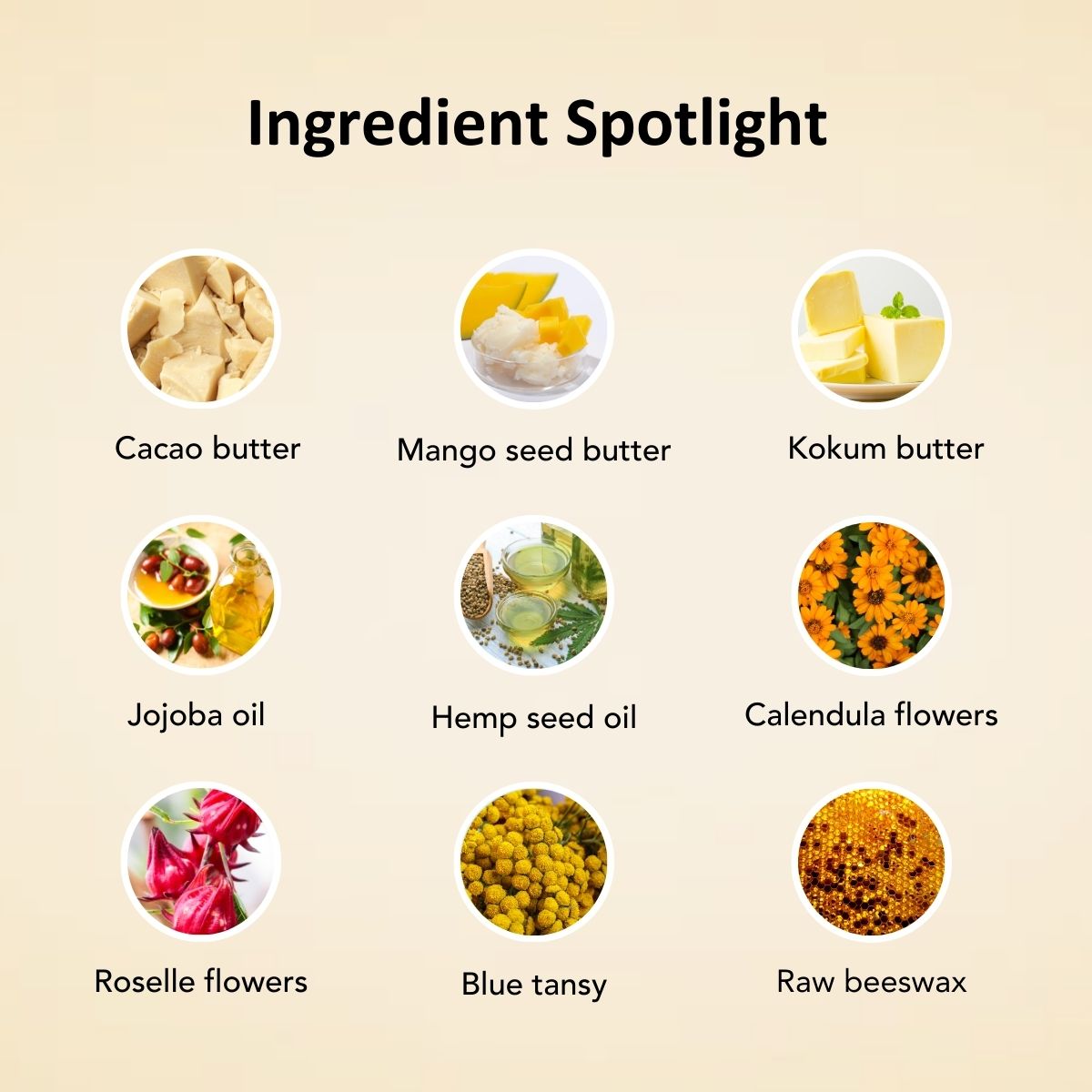 INGREDIENTS: Raw Cacao Butter (Theobroma)*, Raw Mango seed butter, Raw kokum butter, Cold-pressed Raw Jojoba Oil (Simmondsia Chinensis)*, Cold-pressed RawHempSeed Oil*, Whole Calendula Flowers (Calendula Officinalis)*, Whole Roselle Flowers (Hibiscus Sabdariffa)*, Blue tansy , Raw Beeswax (Cera Alba)*, Natural Vitamin E (Tocopherol)*